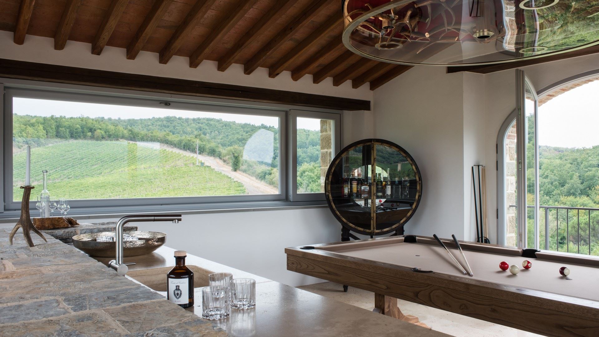 Dining outdoors is a must; a shady "loggia" with a large dining table. Nearby are a wood-fired pizza oven and a grill. Lounging by the pool or having an aperitif in the shade at the nearby beautiful stone table is possible. Inside, the rooms are spacious and cool. Each room has its own spacious bathroom. There is a gym and a wellness area dedicated to relaxation. The massage room and steam bath are located on the ground floor. In the tower above, there is a stunning 360-degree view from the "Whiskey Bar," sunset included. The professional kitchen, made by local craftsmen in Florence, boasts an exceptional selection of cooking appliances and food storage. The host can choose whether to dine on the various terraces or at the main table inside the dining room.