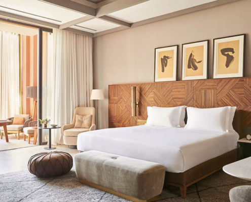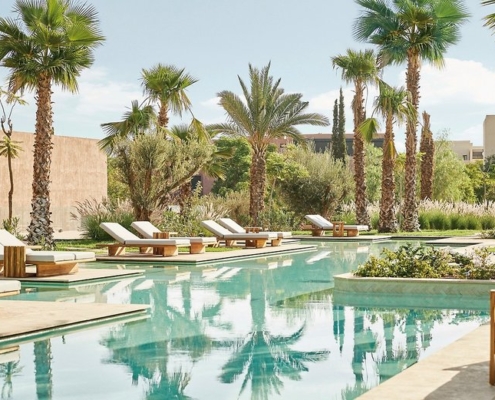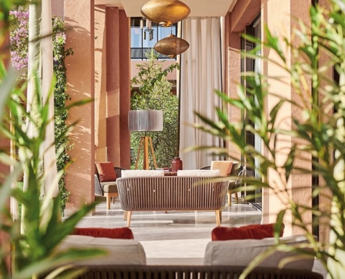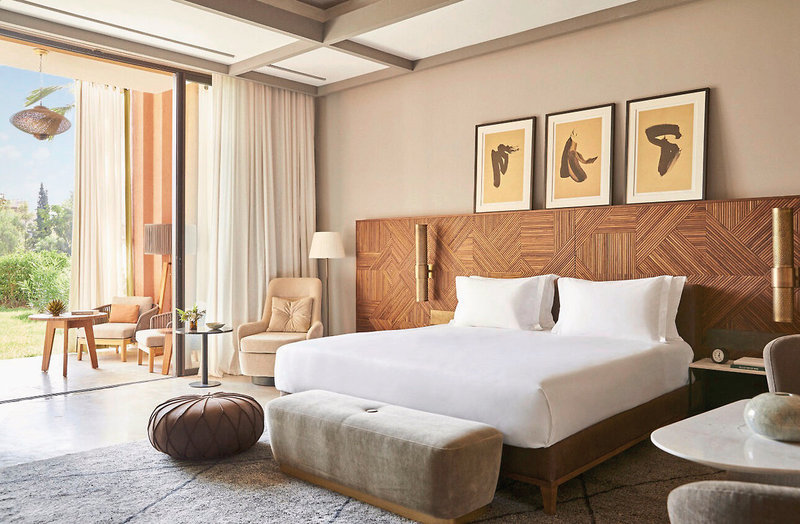 Die Zimmer: Die 180 geräumigen Zimmer des Hotels, darunter 69 Suiten, vereinen modernen Luxus mit dem verborgenen Charme Marrakeschs. Zur Einrichtung gehört ein Badezimmer mit Regendusche, Bademantel und Föhn, TV, Bose-Soundsystem, WLAN (ohne Gebühr), Minibar, Safe, Espresso-Maschine und eine Klimaanlage. Alle Zimmer und Suiten verfügen über eine private Terrasse.