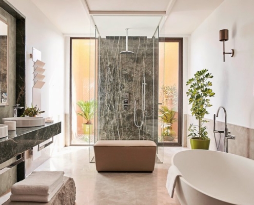 Spa & Wellness: Das luxuriöse, minimalistisch gestaltete Spa im Park Hyatt Marrakech erstreckt sich über 2.200 qm und verfügt über 10 Behandlungsräumen, darunter auch Suiten für Paare. Zur weiteren Ausstattung zählt ein traditioneller Hamam, ein Dampfbad, ein 25m langer Indoorpool sowie drei Außenpools und ein großzügiger Entspannungsbereich. Vervollständigt wird das Wellnesserlebnis durch exklusive Anwendungen und Massagen (gegen Gebühr).
